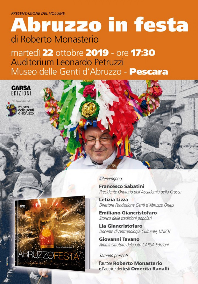 Martedì 22 ottobre alle ore 17:30, presso l'Auditorium Leonardo Petruzzi (via delle Caserme, 24 - Pescara), sarà presentato un importante Volume, che raccoglie la PRIMA DOCUMENTAZIONE SISTEMATICA E SINCRONA (all'oggi) del FOLKLORE ABRUZZESE, opera del fotografo antropologico Roberto Monasterio, "occhio" storico di Carsa Edizioni.