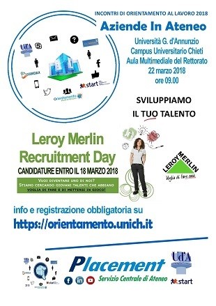 L'Ateneo "Gabriele d'Annunzio", in collaborazione con la sede di San Giovanni Teatino della Catena della GDO Leroy Merlin, propone una giornata di orientamento e recruiting per i propri studenti e laureati. Seguono istruzioni su come partecipare, Profilo Aziendale e Figure ricercate.