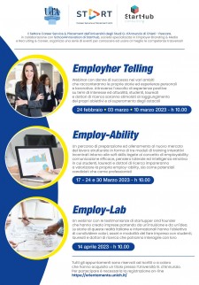 - Employ-Ability - Un percorso di preparazione ed allenamento al nuovo Mercato del Lavoro strutturato in forma di tre moduli di training interattivi incentrati intorno alle soft skills legate al concetto di employability: comunicazione efficace, pensiero laterale ed intelligenza emotiva in cui studenti, laureati e dottori di ricerca impareranno a valorizzare la propria employ-ability, sia come potenziali candidati che come professionisti - 17, 24 e 30 marzo 2023, h 10.00