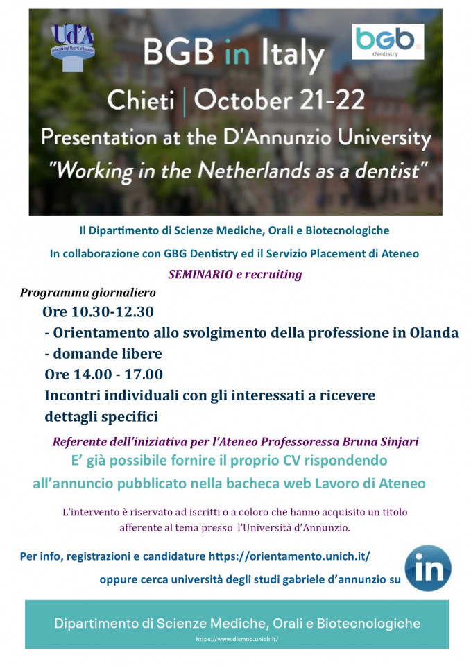 L’evento è organizzato in collaborazione con l'azienda olandese BGB Dentistry ed il Servizio Placement di Ateneo, è riservato a tutti gli iscritti ed a quanti hanno già acquisito un titolo presso l'Università di Chieti - Pescara, afferente al tema delle giornate.