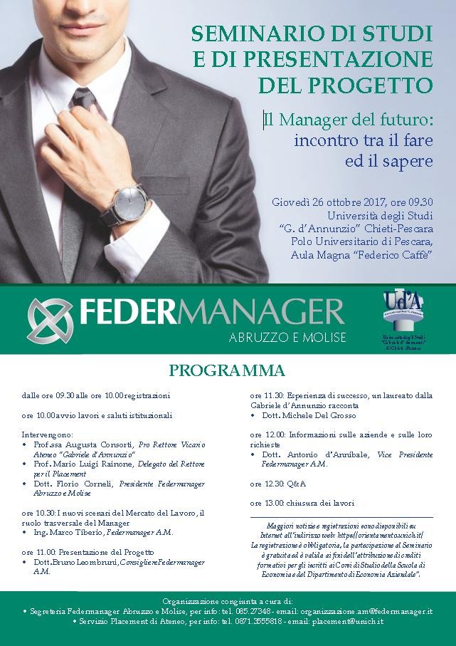 L’iniziativa progettuale di alternanza Scuola-Lavoro, promossa da Federmanager Abruzzo e Molise è rivolta a tutti i Dipartimenti. L’Associazione Federmanager, infatti, intende intercettare potenziali esigenze di R&D delle imprese da poter approcciare, almeno in una prima fase, tramite interventi di tirocinio (curriculari per crediti o liberi ovvero che non prevedono l’attribuzione di CFU) riservati a studenti anche nell’ambito della stesura di Tesi di Laurea.