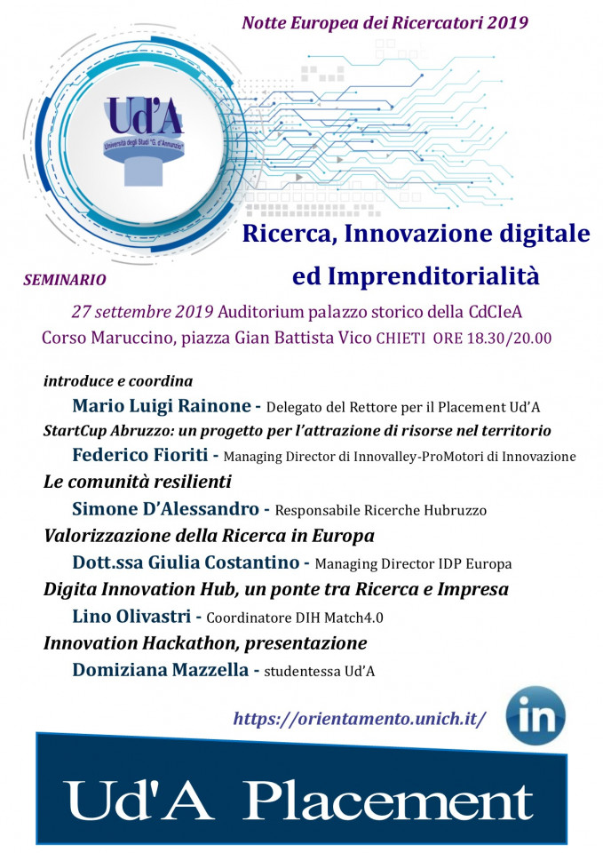In piazza San Giustino sarà allestito anche un desk riservato al Placement a disposizione dei visitatori la manifestazione. Saremmo lieti di poter fornire maggiori prime notizie in merito a tale ultimo aspetto presso il desk riservato al Placement, allestito in piazza San Giustino. Presso l’auditorium del palazzo storico della Camera di Commercio Industria e Artigianato, piazza Gian Battista Vico (accessibile da Corso Maruccino), a partire dalle ore 18.30 si terrà l’intervento “Ricerca, Innovazione digitale ed Imprenditorialità” che darà modo di portare alla platea importanti notizie sui continui cambiamenti in atto nel mondo del Lavoro e della Impresa.